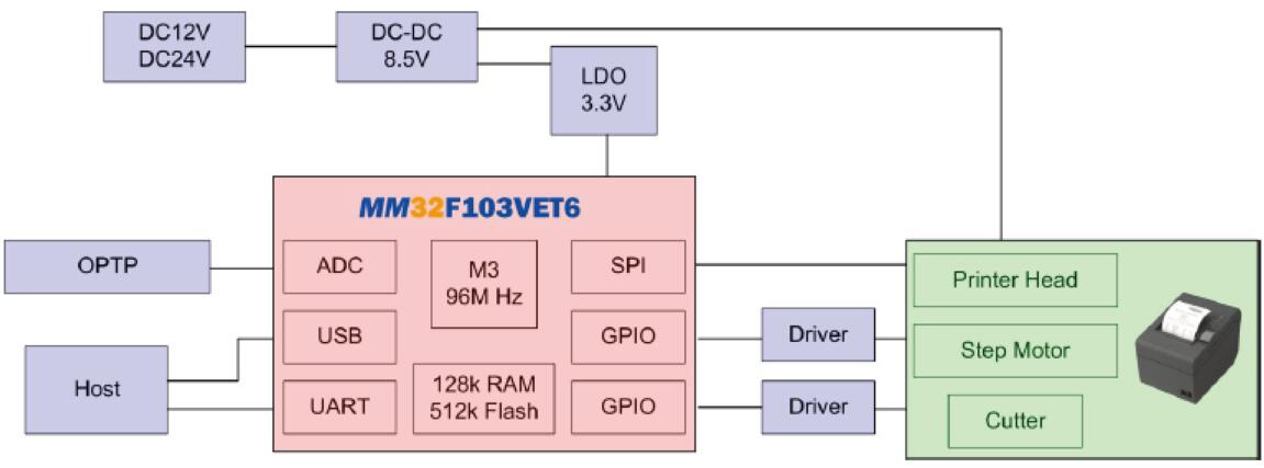 打印機(jī) | MM32F103VET6 | ● 一維、二維碼打印機(jī) ● 票據(jù)打印 ● 有線、無線打印 |