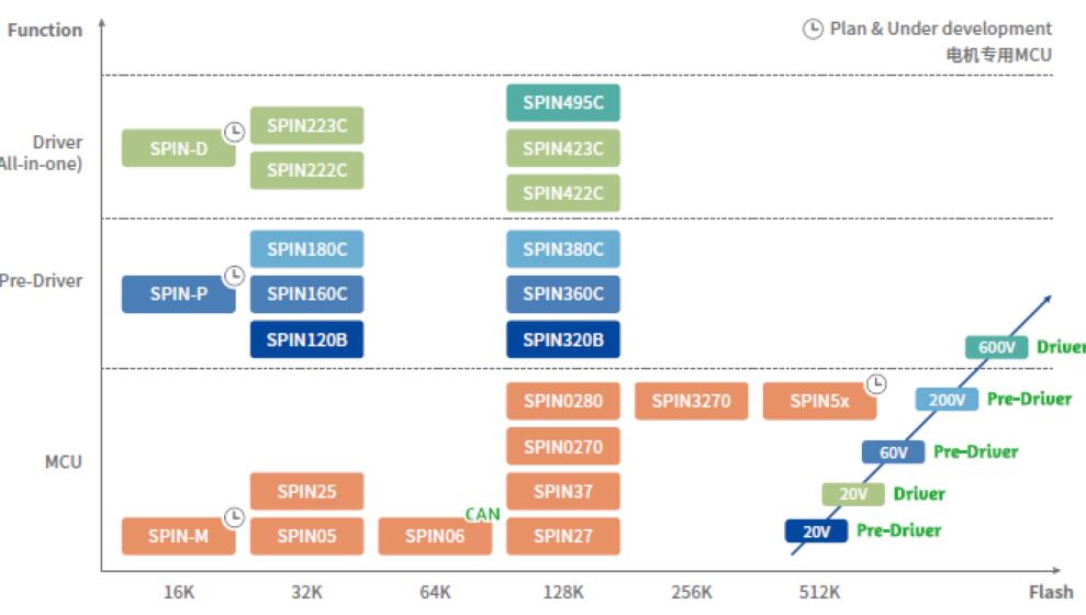MM32SPIN是電機與電源相關(guān)應(yīng)用設(shè)計的專用產(chǎn)品家族,使用高性能ArmCortex-M0與ArmCortex-M3內(nèi)核,依據(jù)功能區(qū)分成專用MCU與驅(qū)動MCU兩種。MM32SPIN系列最高提供了128KB Flash,內(nèi)置了多路UART、I2C、SPI、CAN以及多種高精度模擬外設(shè),包括:比較器、12位3MspsADC與運算放大器。驅(qū)動MCU提供了集成電源的功能,預(yù)驅(qū)、LDO以及MOSFET等豐富的外設(shè),規(guī)劃的電壓范圍有20V、60V、200V以及600V,產(chǎn)品豐富且應(yīng)用涵蓋廣泛??偞碛⑸形⑻峁╅_發(fā)板測試及例程支持。