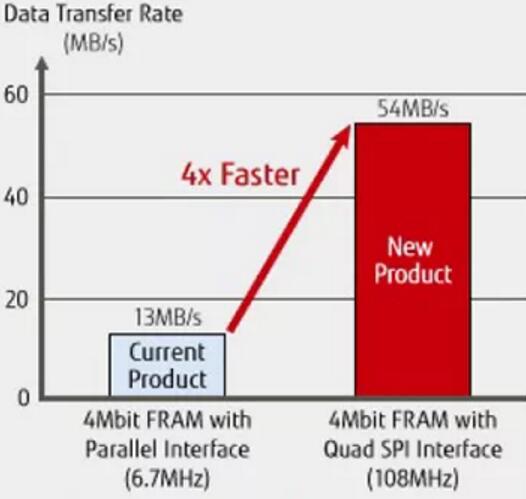 FRAM MB85RQ4ML。這種非易失性存儲器可以在最高108MHz的工作頻率和帶有四個I/O引腳的Quad SPI接口下實現(xiàn)每秒54MB的數(shù)據(jù)傳輸速率。
