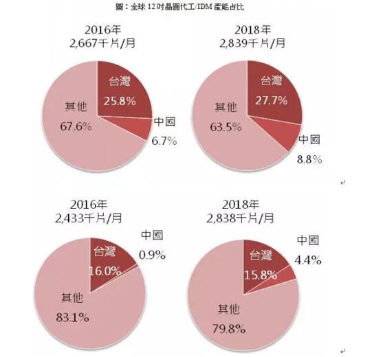 因此2018年中國企業(yè)規(guī)劃的新增產(chǎn)能目標(biāo)將可能難以實(shí)現(xiàn),預(yù)期下修到7.2萬片,其中中國廠商的先進(jìn)制程(28nm含以下)產(chǎn)能約1.2萬片,占新增產(chǎn)能近17%,預(yù)計2018年中國自主非存儲器產(chǎn)能將占全球非存儲器產(chǎn)能比重約6.7%。