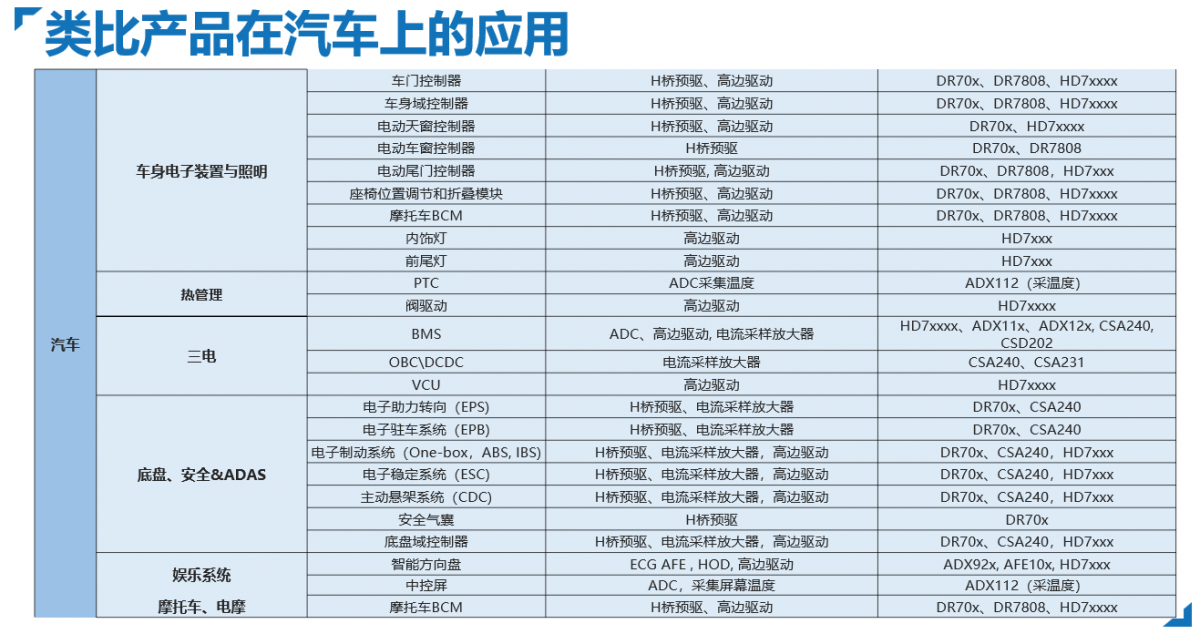 類比半導(dǎo)體高邊驅(qū)動產(chǎn)品可用于驅(qū)動車身控制域中的各種阻性、感性及容性負載的驅(qū)動,其在車內(nèi)外的應(yīng)用非常廣泛,包括車內(nèi)飾燈、頭尾燈、座椅和方向盤及后視鏡加熱、電磁閥、門鎖、電機等場景。