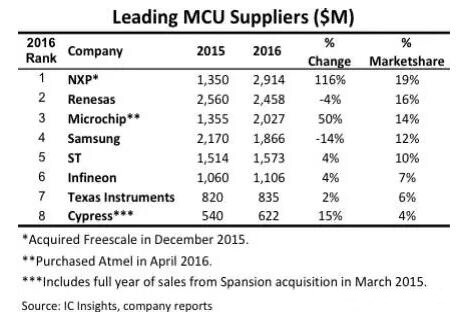 隨著物聯(lián)網(wǎng)領(lǐng)域應(yīng)用對MCU需求的進一步增長。為了搶占市場份額,供應(yīng)商們進行了多次的并購,并最終改變了MCU的供應(yīng)商排名。根據(jù)IC Insights的統(tǒng)計,全球最大的MCU供應(yīng)商由收購了Freescale的NXP擔(dān)當(dāng),而Microchip、Cypress也通過收購,提高營收,擴大了在MCU市場的份額。但因為在2016年,MCU的增長并沒有那么明顯,那就沒有更多的收購事件發(fā)生。