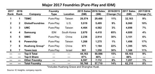 根據(jù)IC Insights最新研究報告顯示,2017年全球八大晶圓廠商銷售額總計達(dá)551.03億美元,同比增長9%,比2016年的15%增速有所放緩。這8家廠商2017年的市場份額達(dá)到88%,市占率與2016年相同。