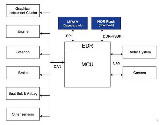 圖 1 為 ADAS 系統(tǒng)如何利用 MRAM 和 NOR 閃存的簡化框圖。外部 NOR 閃存通常用于存儲啟動代碼。然而,ADAS 系統(tǒng)中的各種傳感器通過 CAN(控制器局域網(wǎng))接口定期向 MCU 發(fā)送數(shù)據(jù)。MCU 運行自適應(yīng)算法,檢查是否可能碰撞或已經(jīng)發(fā)生碰撞。處理算法的運行時間變量和傳感器的當(dāng)前狀態(tài)則存儲在 MCU 的存儲器中。