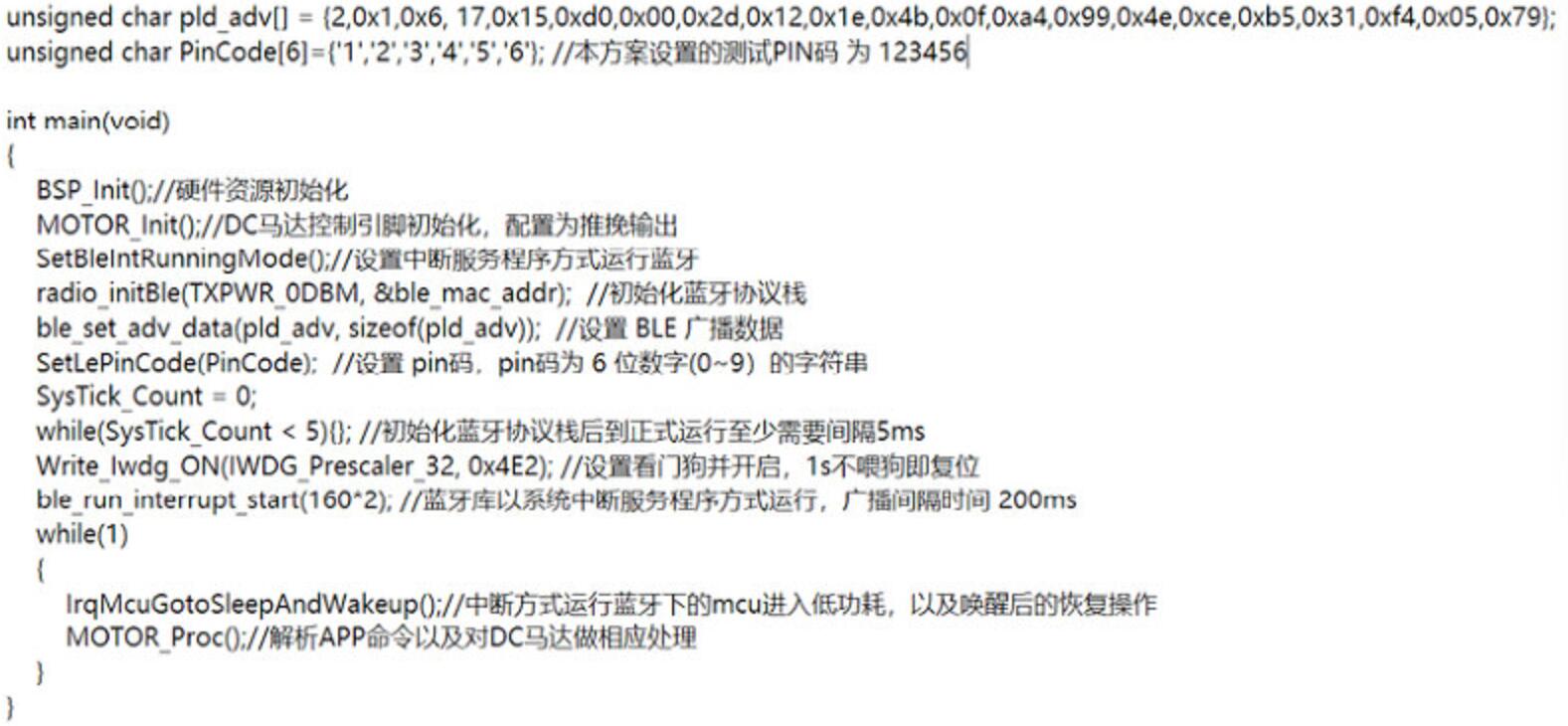 以下為主函數(shù)初始化配置內(nèi)容,主要將所有的外設(shè)資源和藍(lán)牙協(xié)議棧初始化,并且以中斷服務(wù)程序的方式運(yùn)行藍(lán)牙,主函數(shù)的循環(huán)中主要實現(xiàn)的功能為判斷是否進(jìn)入低功耗模式,并且喚醒后根據(jù)接收到的藍(lán)牙數(shù)據(jù)對DC馬達(dá)進(jìn)行不同的操作,代碼如下: