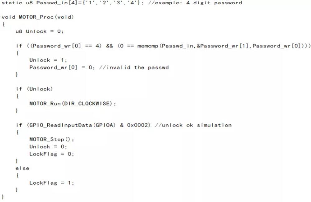 在MOTOR_Proc()處理函數(shù)中針對藍(lán)牙接收到的密碼數(shù)據(jù)進(jìn)行解析,如果與默認(rèn)設(shè)置的4位0-9數(shù)字密碼完全匹配上則操作解鎖,將DC馬達(dá)按照設(shè)定方向控制運(yùn)轉(zhuǎn),為了簡易驗證,模擬一個信號表示解鎖成功,這里是通過采集指定IO引腳PA1的輸入來實現(xiàn),采集到輸入為高電平那么停止DC馬達(dá)轉(zhuǎn)動,且清零鎖定標(biāo)志位。以下為代碼實現(xiàn)內(nèi)容: