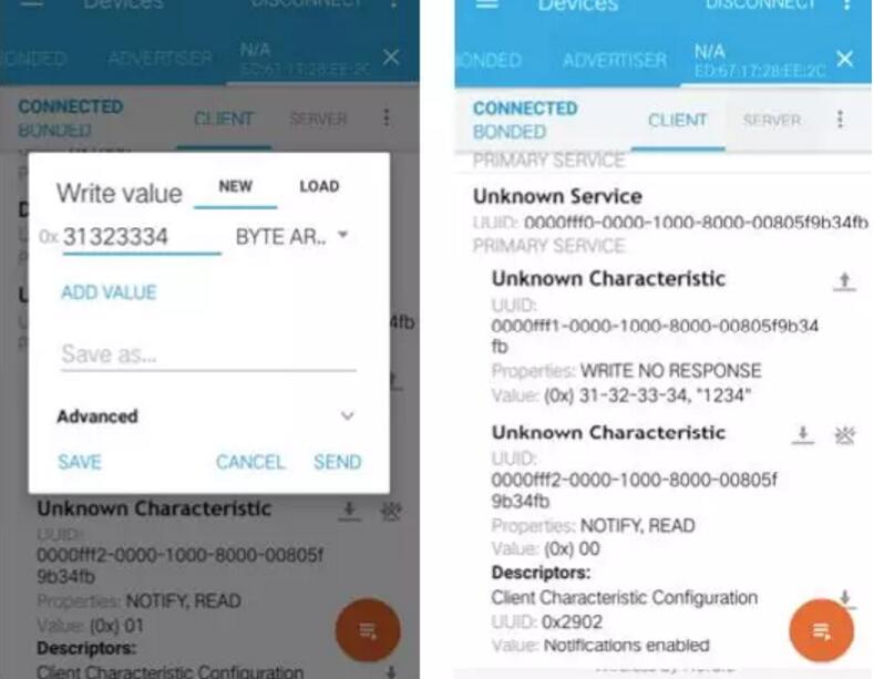 連接成功后,對UUID為fff1的特征值寫0x31323334(模擬用戶輸入密碼”1234”),測試板上連接的馬達(dá)開始轉(zhuǎn)動,執(zhí)行開鎖動作;