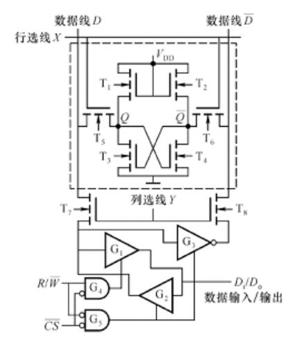 其中存儲(chǔ)單元通過T5、T6和數(shù)據(jù)線(位線)相連;數(shù)據(jù)線又通過T7、T8和再經(jīng)輸入/輸出緩沖電路和輸入/輸出線相連接,以實(shí)現(xiàn)信息的傳遞和交換。寫入信息的操作過程,在第一次寫入信息之前,存儲(chǔ)單元中的信息是隨機(jī)信息。