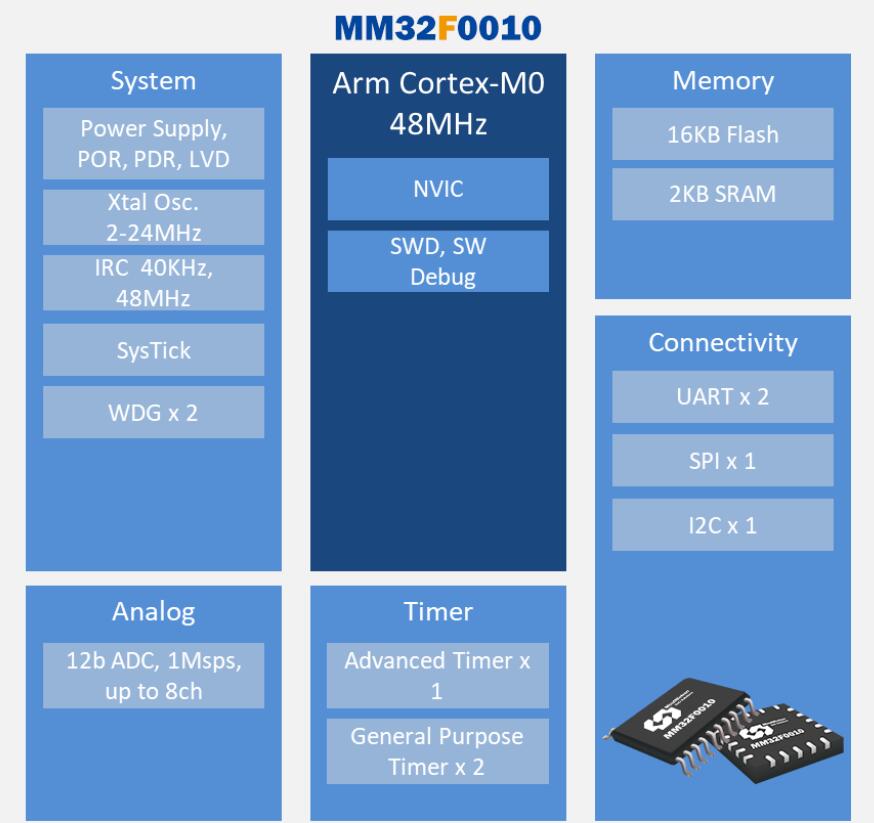 MM32F0010在性能、功耗和外設(shè)配置方面具有顯著的特點,其中包括: