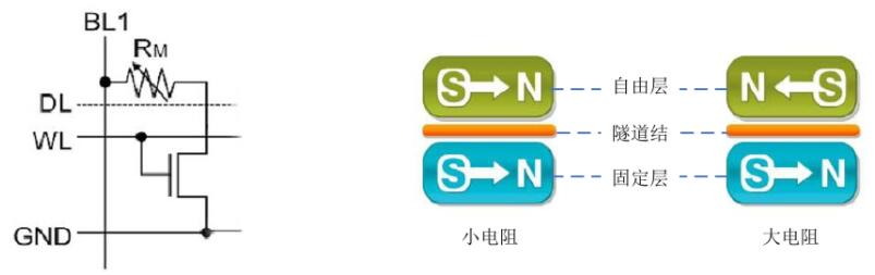 MRAM是以磁性隧道結(jié)(MTJ)儲(chǔ)存單元為基礎(chǔ)。MTJ中包含了一個(gè)維持單一極性方向的固定層,和一個(gè)通過隧道結(jié)與其隔離的自由層。當(dāng)自由層被施予和固定層相同方向的極化時(shí),MTJ的隧道結(jié)便會(huì)顯現(xiàn)出低電阻特性;反之MTJ便會(huì)有高電阻。此磁阻效應(yīng)可使MRAM不需改變內(nèi)存狀態(tài),便能快速讀取數(shù)據(jù)。當(dāng)流經(jīng)兩金屬線的電流足以切換MTJ的磁場(chǎng)時(shí),在兩金屬線交點(diǎn)的MTJ就會(huì)被極化(寫入)。此過程能以