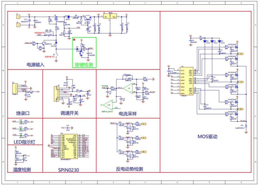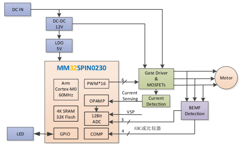 下圖是MM32SPIN0230無(wú)感方波方案硬件框圖。