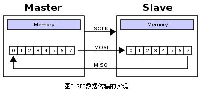 這是通過移位寄存器來實現的。如圖2所示,主機和從機各有一個移位寄存器,且二者連接成環(huán)。隨著時鐘脈沖,數據按照從高位到低位的方式依次移出主機寄存器和從機寄存器,并且依次移入從機寄存器和主機寄存器。當寄存器中的內容全部移出時,相當于完成了兩個寄存器內容的交換。