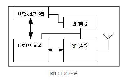 結(jié)構(gòu)最簡單的ESL由一個LCD或電子、RF模塊、墨水顯示屏、配套處理器、紐扣電池和低引腳數(shù)存儲器(易失性和非易失性存儲器)構(gòu)成??梢愿鶕?jù)需求功能的不同,將所需要的價格走向,購買走向和當前庫存信息存儲在ESL中,待一天結(jié)束刷新中央服務器的數(shù)據(jù)。如果要實現(xiàn)用一顆小紐扣電池供電并維持數(shù)幾年的工作機能需要讓整個系統(tǒng)使用一個低功耗控制器和存儲器?;趦?nèi)置的連接選項(通常是BLE或Wi-Fi),板載存儲器可兼作協(xié)議棧存儲空間,繞過商場的中央服務器,直接連接用戶手機。