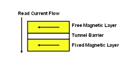 存儲(chǔ)位的置“0”狀態(tài)或置“1”狀態(tài)正是由自由層的極性來(lái)確定的。自由層極性和固定層極性一致時(shí)(指向相同方向),穿越MTJ棧層的阻抗很低(請(qǐng)參閱圖1)。自由層極性和固定層極性180度相反時(shí)(指向相反方向),穿越MTJ棧層的阻抗就很高(請(qǐng)參閱圖2)。由MTJ堆棧中的低阻抗和高阻抗來(lái)確定是否將位元讀為“0”或“1”。