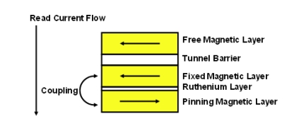 飛思卡爾半導(dǎo)體還通過(guò)增加兩個(gè)附加層來(lái)改進(jìn)固定磁性層。在固定層下面增加了一層釕(Ru)。而在Ru層下面又增加了另一層稱為牽制層(pinning layer)的磁性層。固定層和牽制層的極性相反,將會(huì)引起很強(qiáng)的耦合。該強(qiáng)耦合使固定層的極性保持鎖定,因此不會(huì)在編程操作過(guò)程中引起誤反轉(zhuǎn)(圖4)。