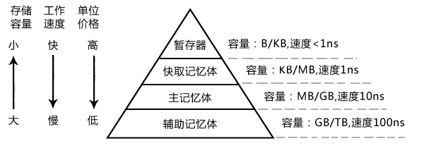 工作速度:輔助存儲(chǔ)器(1ms)< 主存儲(chǔ)器(10ns)< 快取存儲(chǔ)器(1ns)< 暫存器(1ns)。