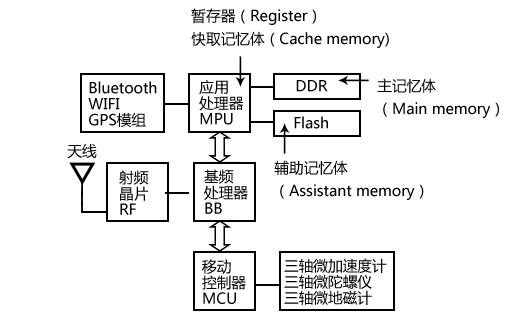 所有的電子產(chǎn)品都必須用到存儲(chǔ)器,而且通常用到不只一種存儲(chǔ)器,由于存儲(chǔ)器的種類繁多,常常讓使用者混淆,我們簡單說明不同存儲(chǔ)器之間的差異,圖三為手機(jī)主要芯片的系統(tǒng)方塊圖(System block diagram),包括:應(yīng)用處理器(Application processor)、基頻處理器(Baseband processor)、運(yùn)動(dòng)控制器(Motion Controller)。