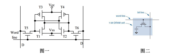 首先來看一張SRAM的基本單元結(jié)構(gòu)圖(圖一),再來看看DRAM的基本單元結(jié)構(gòu)圖(圖二)
