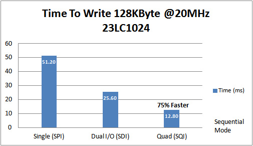 下圖給出了在SPI、SDI和SQI模式下以20 MHz向23LC1024 1 Mb SPI SRAM寫入128 KB存儲(chǔ)內(nèi)容所需的時(shí)間。 從中可看出,SQI比標(biāo)準(zhǔn)SPI快75%。