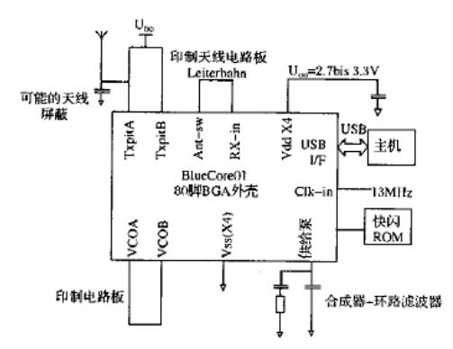 目前所有藍(lán)牙系統(tǒng)中天線的接收機(jī)╱發(fā)射機(jī)之間的高頻功能元件不是安在芯片上的。BlueCore模塊也不例外,但整個(gè)芯片是用CMOS技術(shù)制造的,接收機(jī)具有比雙極技術(shù)制造的設(shè)備的線性高得多,所以對(duì)濾波器實(shí)現(xiàn)較簡單。