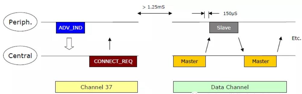 低功耗藍牙芯片特有的設(shè)計,也是其快速建立連接的基礎(chǔ)。低功耗藍牙設(shè)備之間建立連接的過程如下: